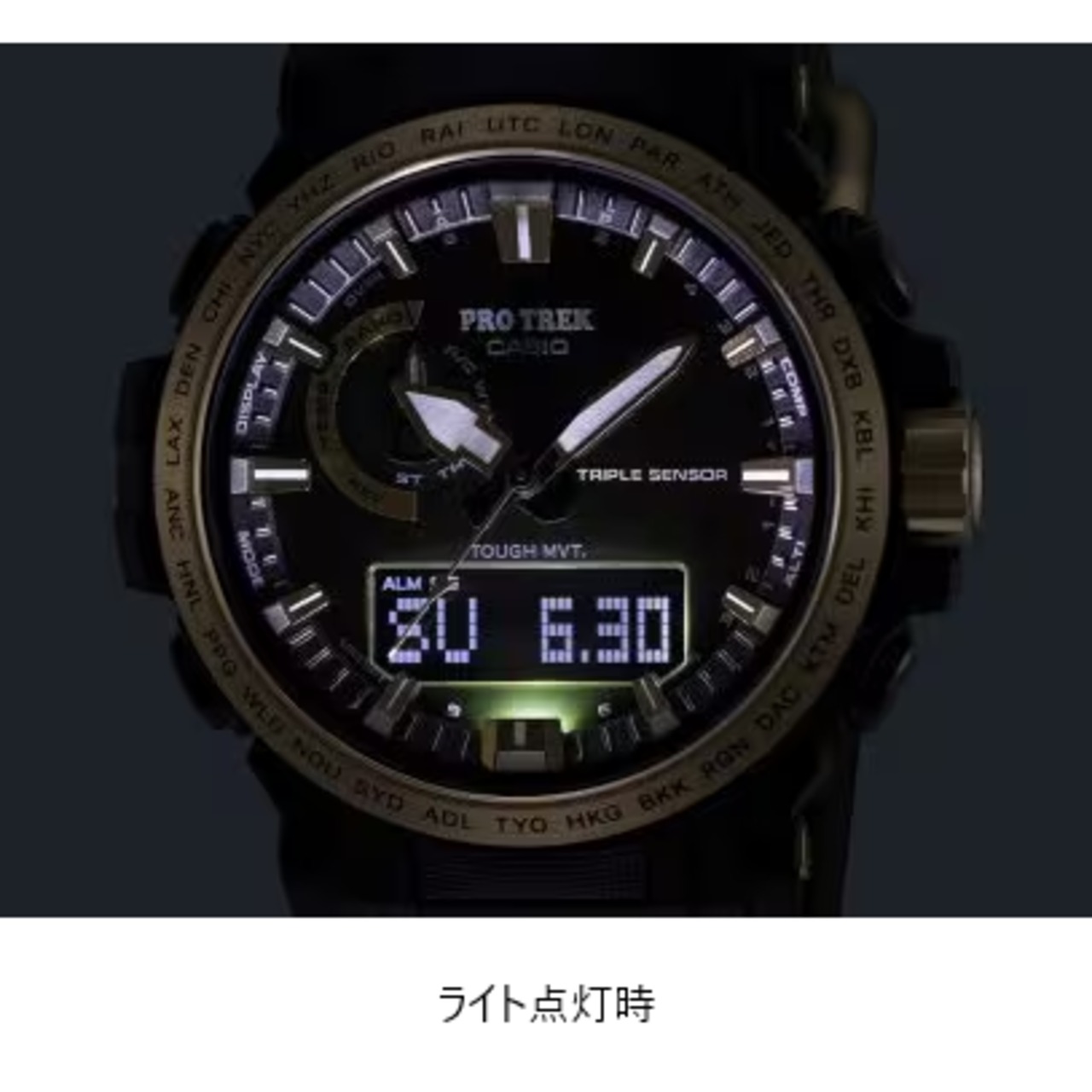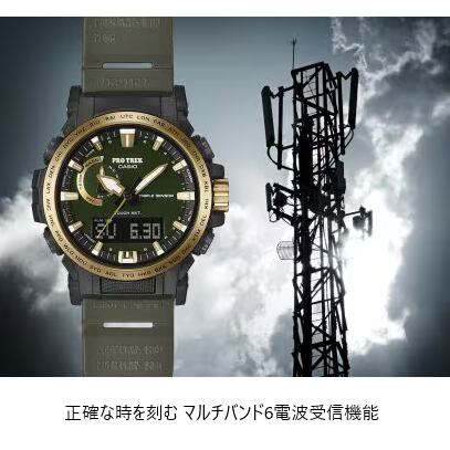 機能面では方位・気圧・高度・温度を正確に計測。タフソーラーで安心して長時間使用でき、マルチバンド6で常に正確な時刻を表示します。