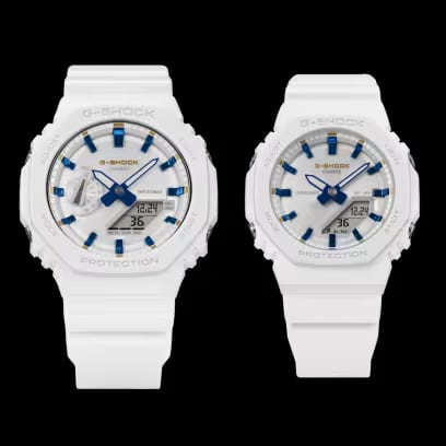 ダイアルに透明蒸着を施し質感を高め、インデックスにはブルー蒸着を施し、シルバー・ゴールドの差し色がクリスマスの華やかさを演出。マットホワイトのベゼルとバンドに、G-SHOCKロゴおよびアワーマーカーのゴールドが特別感を添えます。裏蓋にはラバーズコレクションのシンボル「天使&悪魔」を刻印。大切な人との絆を見守ります。