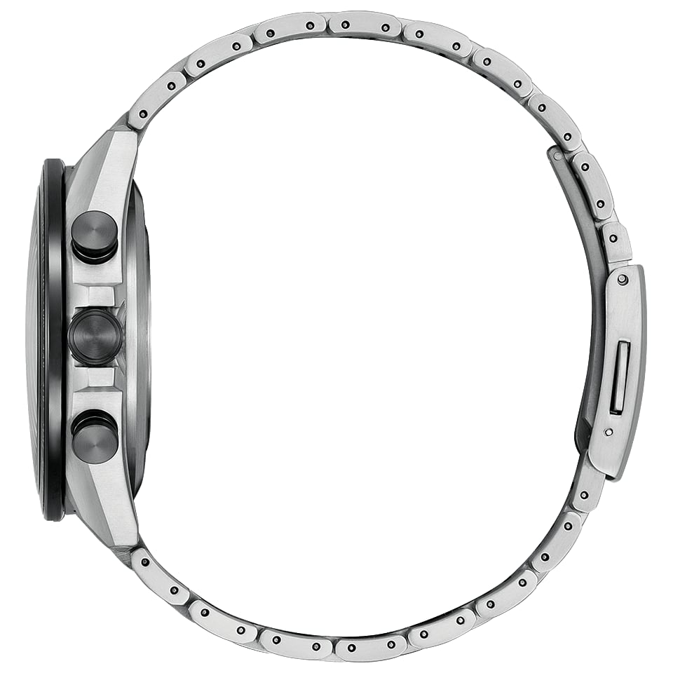 文字板にはヘアライン状のパターンとメタリック塗装を施し、金属のような質感を表現しました。ベゼルには、艶やかな光沢を放つサファイアガラスを採用。シルバー蒸着で閉じ込められた都市名が手元を彩ります。ケースとバンドはシルバー。ベゼル、プッシュボタン、りゅうずはブラックでデザイン。シルバーとブラックのコントラストが、スポーティな印象を際立たせ、大人の個性が感じられる1本です。