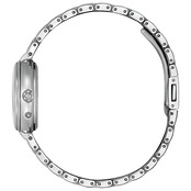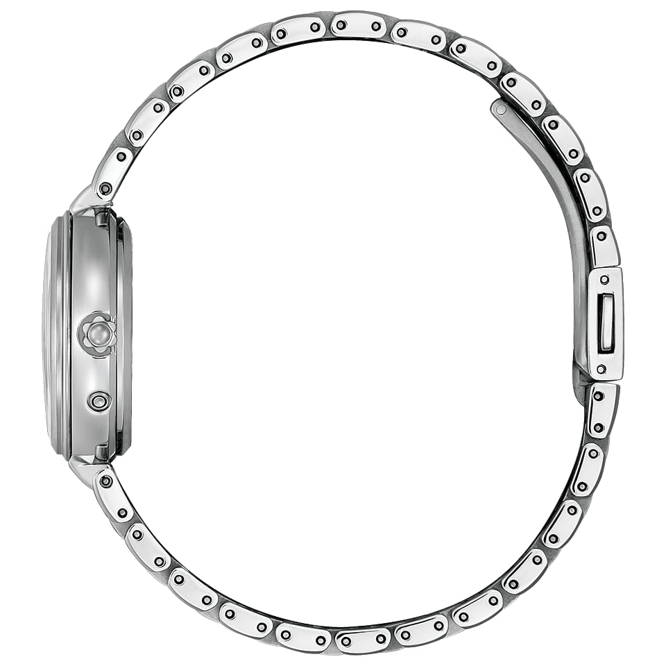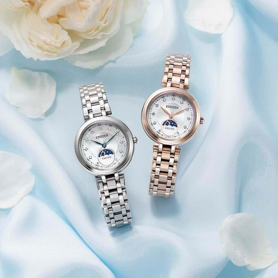 曲線を多用した柔らかな印象のケースに、ミラー加工とヘアライン加工を織り交ぜた多列バンドを用いたブレスレット感覚のデザイン。白蝶貝文字板の中央にクラシックな彫刻パターンを描き、華やかな印象に仕上げました。インデックスに9ポイントのダイヤモンドをあしらい、よりエレガントな雰囲気を演出。太陽と月のモチーフが時間の経過とともに変化する表情を楽しむことができる「サン&ムーン機能」を搭載しています。