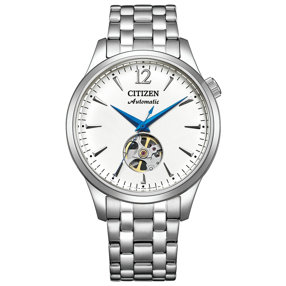 クラシカルモダンなデザインで、6時の位置の窓からメカニカルウオッチの心臓部であるテンプの繊細な動きを堪能できるオープンハート仕様。円形の窓から放射状に広がる文字板のパターンが特徴的なデザインです。裏ぶたはシースルーバック仕様。回転する錘(おもり)部分とメカの動きを楽しめます。