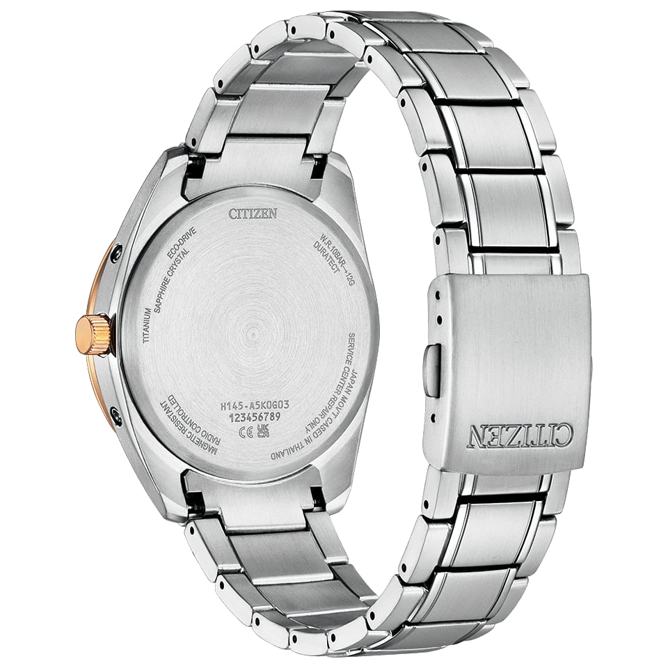 CITIZEN COLLECTIONでは唯一、ケースとバンドにスーパーチタニウム™を採用した、ベーシックな3針モデルをアレンジ。ピンクゴールドのベゼルを合わせたツートン仕様で、普段使いしやすい色合いの中に華やかさと限定感をプラスしました。インデックスと針はベゼルに合わせたカラー、文字板にはピンクのラメを入れることで、柔らかな輝きと上品な印象を与えます。