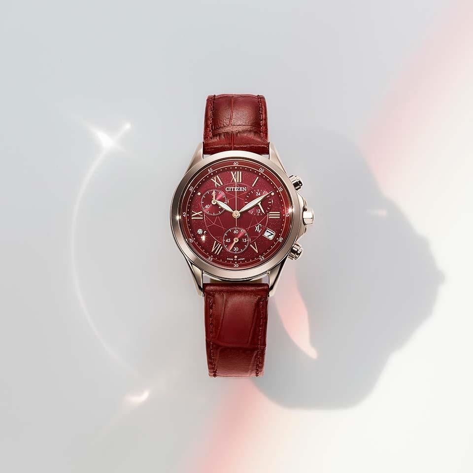 華やかなサクラカラーのケースにダークレッドを組み合わせた、存在感あふれる限定モデルです。ダークレッドの文字板には、ブリリアントカットのビジューをモチーフにしたパターンをあしらい、外周にはラメを散りばめた美しいデザインに。手元を見るたびに、気持ちが華やぎ、自分らしく輝ける自信を与えてくれます。