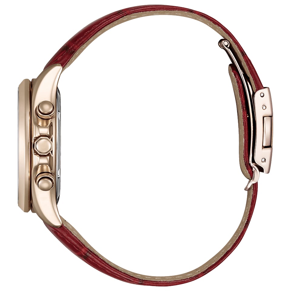インデックスにはローマ数字を採用し、すっきりとした印象に仕上げました。型押しされたダークレッドの革バンドが上質感を高め、手元を美しく、女性らしく引き立てます。