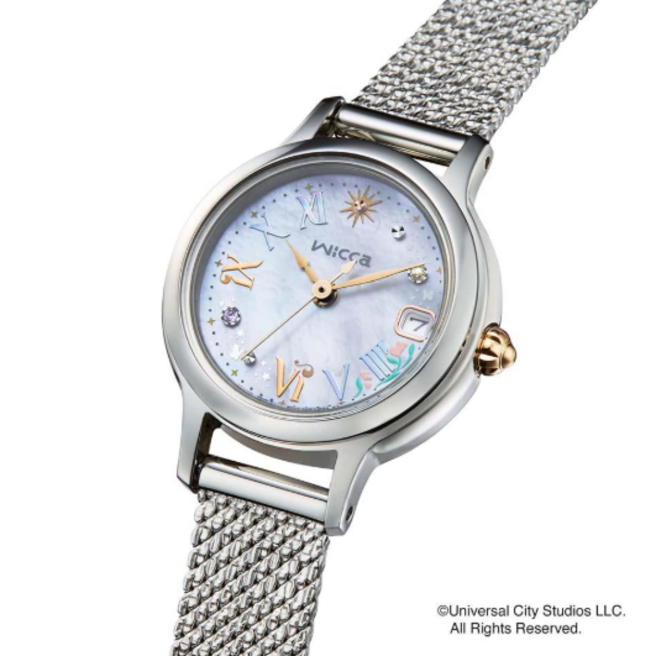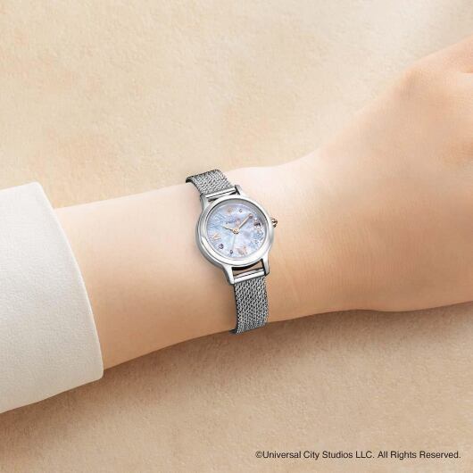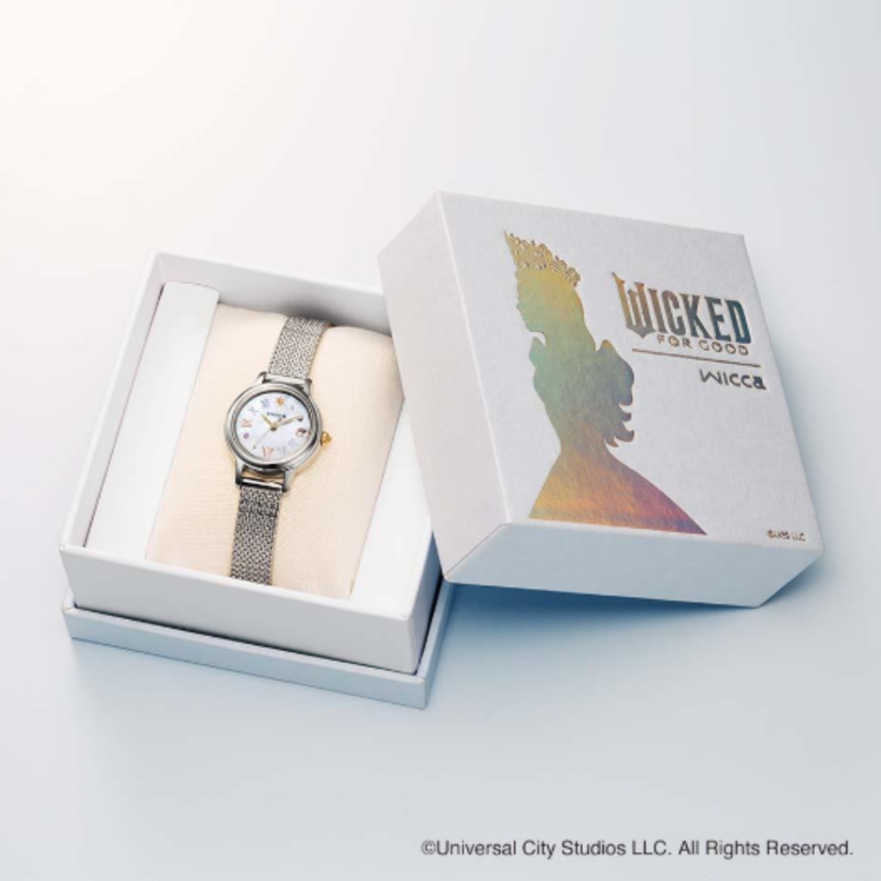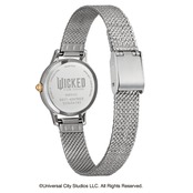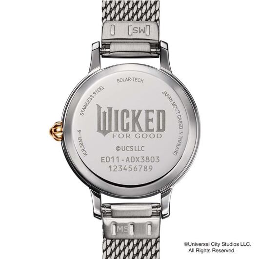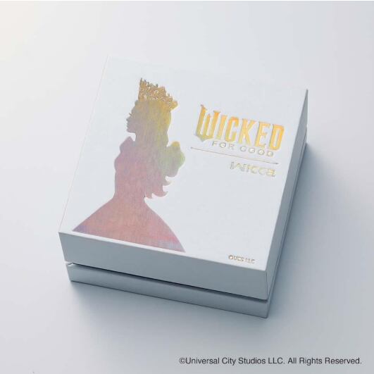 アリアナ・グランデが演じる“善い魔女”「グリンダ」をイメージ。艶やかな白蝶貝文字板とオーロラカラーのインデックスで、「グリンダ」のドレスを表現しました。白蝶貝文字板にお花や蝶をちりばめ、インデックスは「グリンダ」の女性らしい仕草やカールした髪、魔法の杖をイメージしてデザイン。2時と8時の位置にはオーロラカラーと淡いパープルのクリスタルガラスをセッティングしています。裏ぶたには『ウィキッド 永遠の約束』の原題『Wicked: For Good』のロゴを刻印。「グリンダ」のシルエットをあしらったスペシャルBOX付きです。