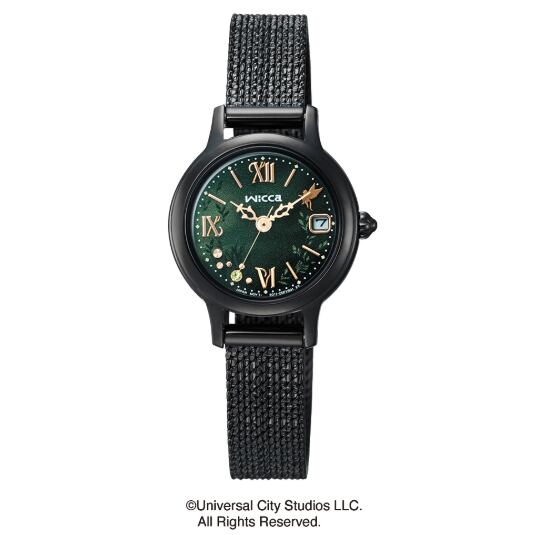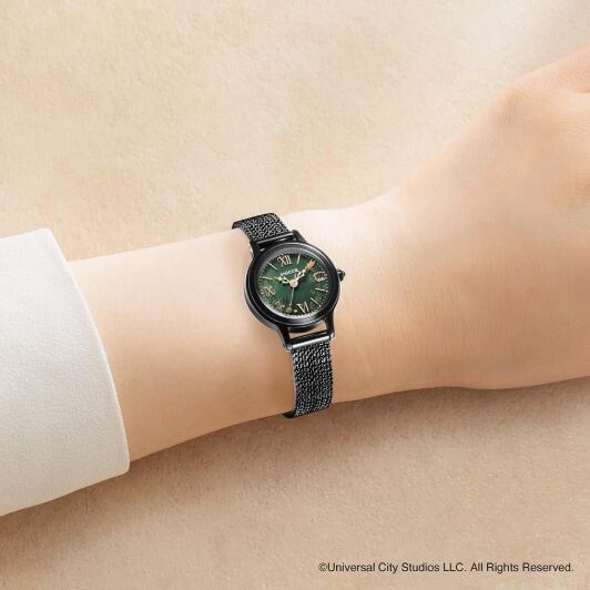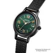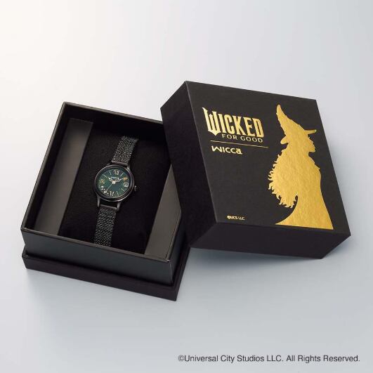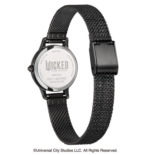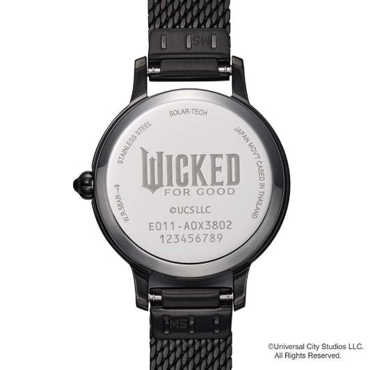 シンシア・エリヴォが演じる“悪い魔女”「エルファバ」をイメージ。文字板に「エルファバ」の森の隠れ家をイメージした植物を描き、西側(左)から広がるグリーンのグラデーションで、繊細に揺れ動く「エルファバ」の心を表現しました。インデックスは、「エルファバ」のほうきや爪をイメージしたデザイン。7時の位置にはグリーンのクリスタルガラスをあしらい、5分毎の切分もグリーンにしています。2時の位置には物語に登場する「フライング・モンキー」が描かれています。裏ぶたには『ウィキッド 永遠の約束』の原題『Wicked: For Good』のロゴを刻印。「エルファバ」のシルエットをあしらったスペシャルBOX付きです。