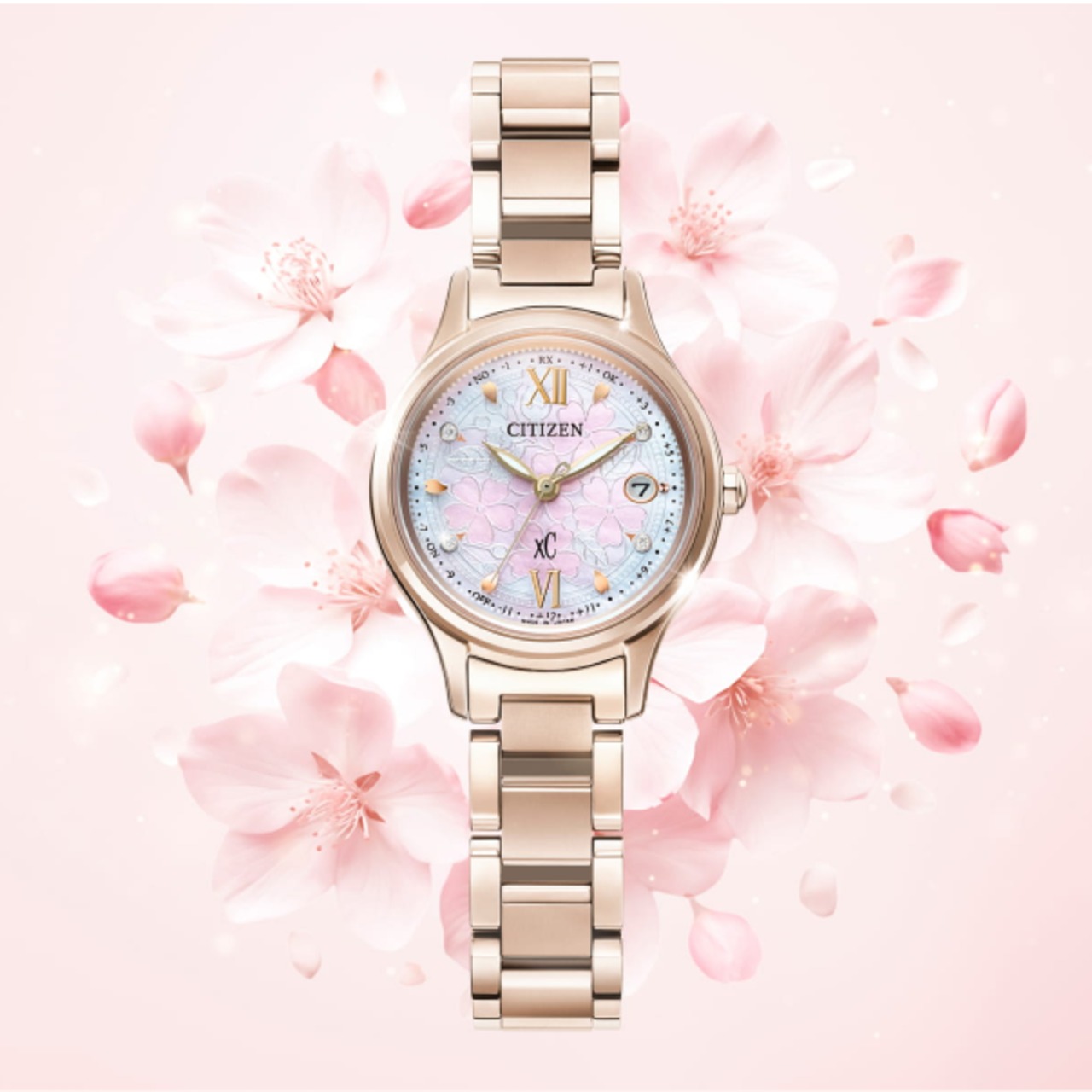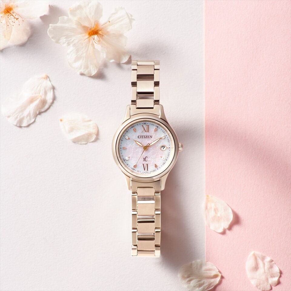 桜の花をぎゅっと詰め込んだフラワーボックスをモチーフにしたデザインです。白蝶貝の文字板へ桜の花やつぼみをエッチングで表現し、4ポイントのラボグロウン・ダイヤモンドをあしらいました。華やかに自分を開花させ、新しいスタートを飾ってほしいと想いを込めた特別感あふれる限定モデルです。