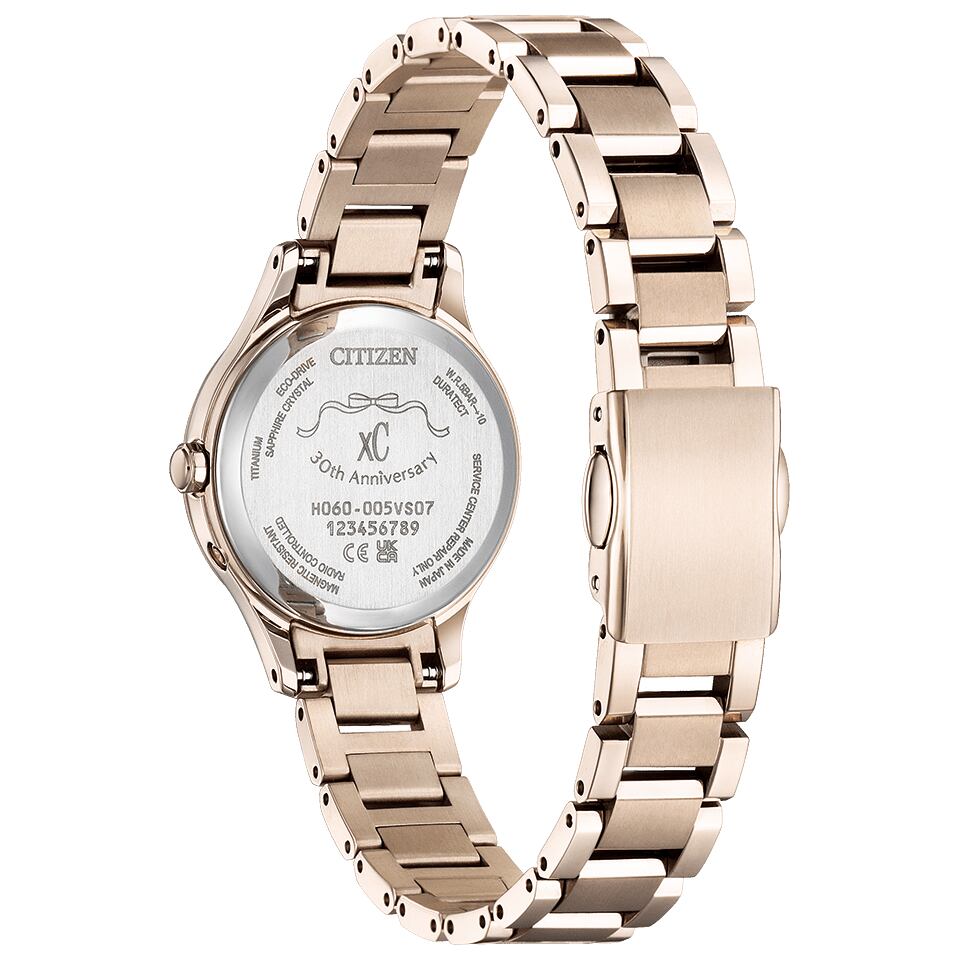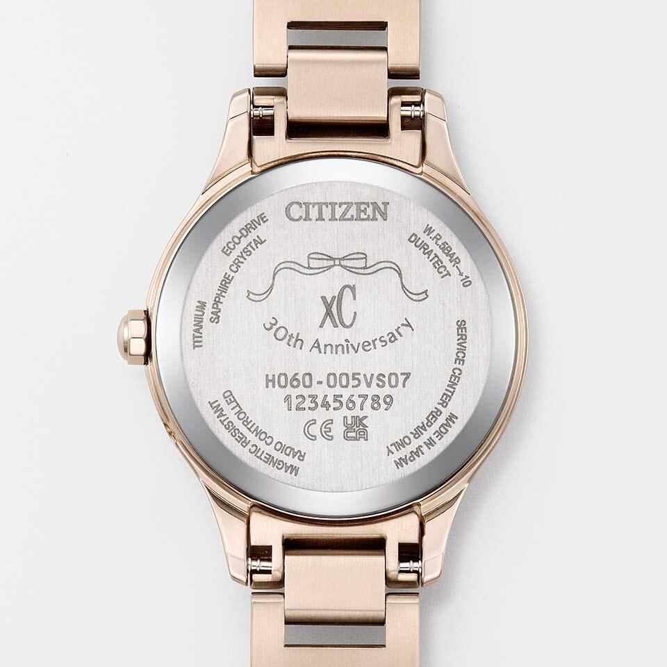 裏蓋には、xCロゴと30周年を記念したモチーフが刻印されています。ピンクとホワイトの特別なボックスと、可憐な桜の刺繍が施されたクッションにより、時計を優しく包み込むように収納できます。