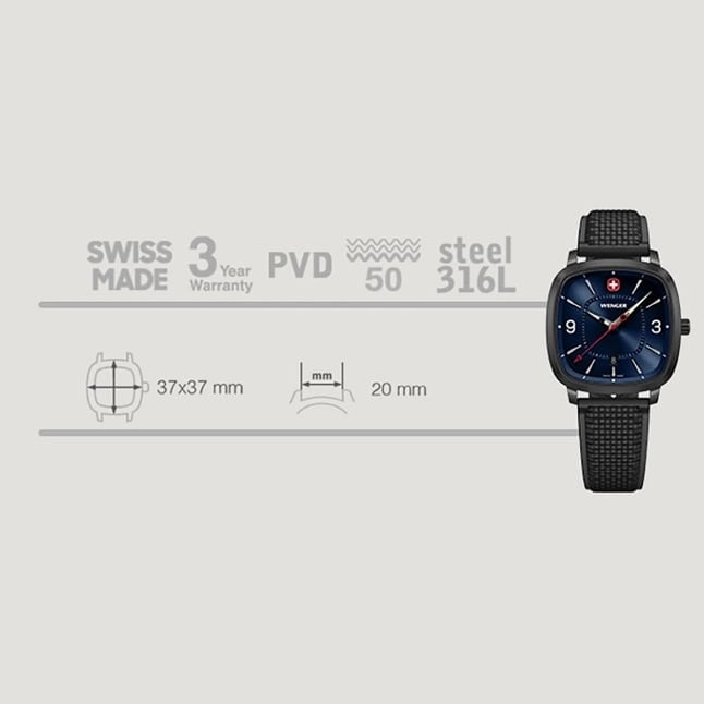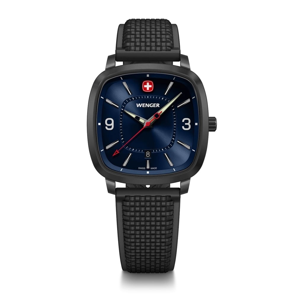 革新的なケースは、ウェンガーのロゴを象徴する極楕円形を模しており、スイス製ならではの卓越した精度を誇ります。耐久性に絶対的な自信があるため、3年間の保証が付いています。クラシックなサンブラッシュ仕上げの文字盤、6時位置の日付表示窓、大きな数字とスーパールミノバ®を採用したシルバーカラーのインデックスなど、細部にまでこだわったデザインで、暗闇でも時刻を簡単に読み取ることができます。12時位置の赤と白のロゴが、さらにスタイリッシュな印象を与えます。