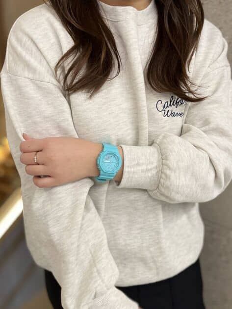 文字板、ロゴ、インデックス、針などのパーツにトーンの異なる同色を配色することで、表情に変化のあるデザインに仕上げると同時に視認性を高めました。美錠とサイドボタンもステンレス素材を使用し、質感を高めています。GMA-S2100にあった9時側の小針をなくし、シンプルでミニマルな印象になるように仕上げました。ベゼル、バンドにはバイオマスプラスチックを採用。